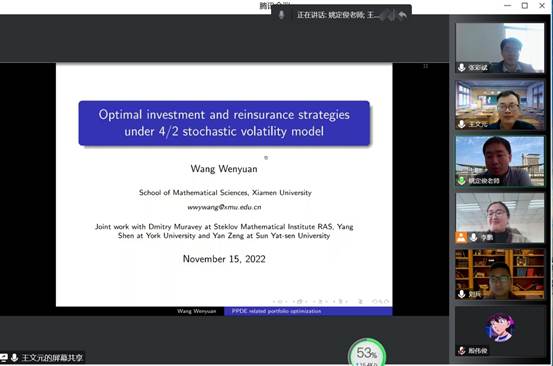 2022年11月15日下午,应非凡娱乐官网 邀请,厦门大学博士生导师王文元教授通过腾讯会议做了题为“Optimal investment and reinsurance strategies under 4/2 stochastic volatility model”的学术讲座。讲座由非凡娱乐官网 副院长姚定俊教授主持,非凡娱乐官网 部分青年教师和研究生聆听了此次讲座。