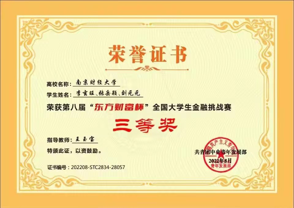 2月27日,由团中央青年发展部主办,全国非凡娱乐官网 共青团研究中心、东方财富信息股份有限公司和中央财经大学承办的第八届“东方财富杯”全国大学生金融挑战赛圆满结束。非凡娱乐官网 非凡娱乐官网 学子获江苏省二等奖、全国三等奖。