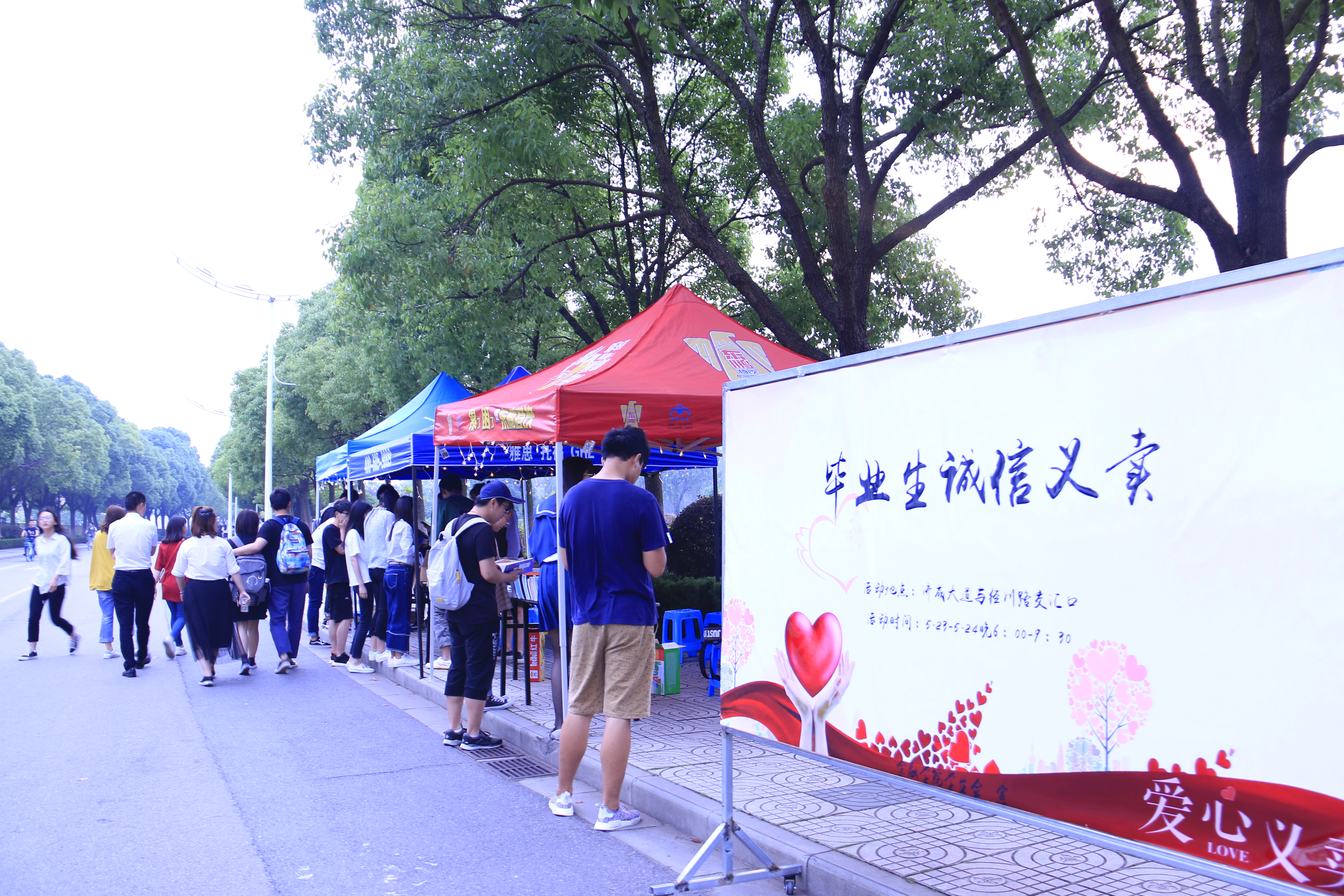 此次活动全校大四毕业生们捐赠了书籍、富有诚信特色的手工艺品和其他闲置物品,分别在“浓浓书香”、“脉脉情深”、“溜溜杂货”和“勃勃生机”四个主题摊位,进行义卖,合唱团与金属公社带来歌曲盛会更是将现场气氛推向高潮。