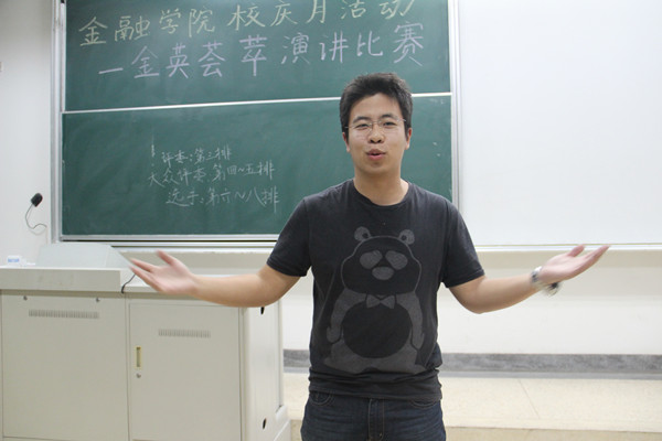 2013年11月8日18点30分,非凡娱乐官网 校庆月活动“金英荟萃”之英语演讲比赛在专三101拉开帷幕。来自大一的八位同学和大二的十位同学参加了此次比赛。Yunlan Zhu老师、知行学社副社长景玲玲、院辩队队长卞媛、英语沙龙协会部长陆梦颖、邵雅茹以及金融俱乐部负责人黄泽凡组成专业的评委阵容。金融院各班学生代表作为大众评审参与了本次比赛。