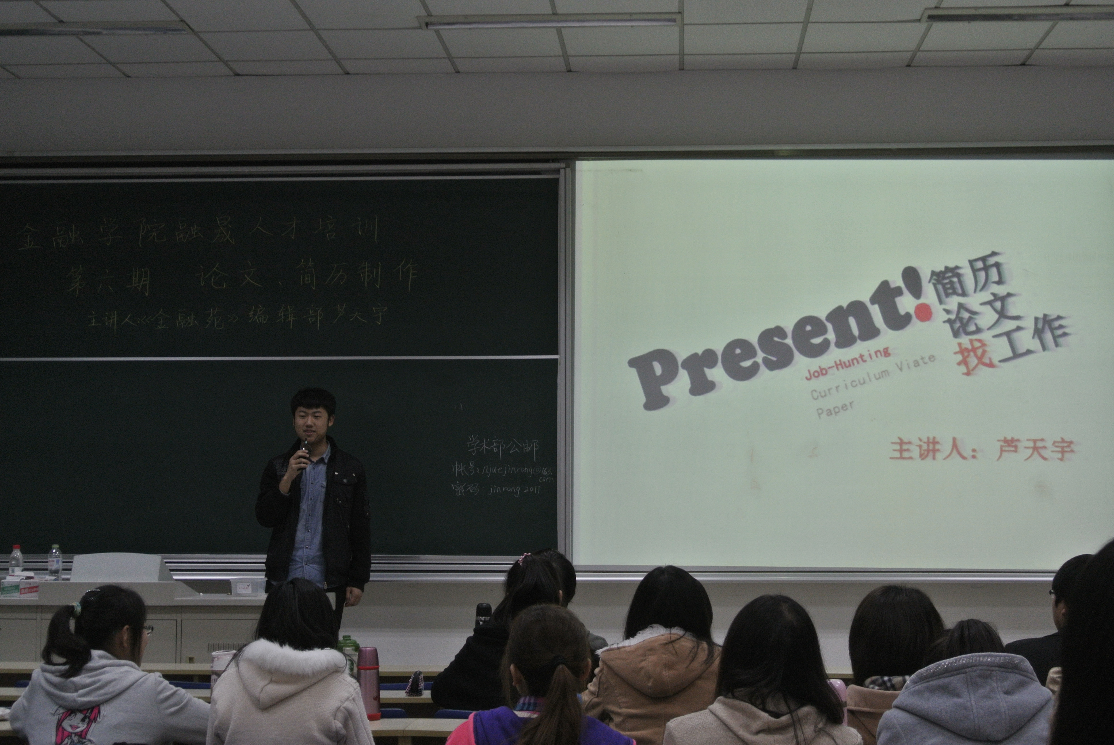 2013年3月19日晚18:30,非凡娱乐官网 融晟人才培训第六期在非凡娱乐官网 经济学科楼117如期举行。本次培训主要由非凡娱乐官网 《金融苑》编辑部的芦天宇同学讲述一些关于论文写作和制作简历的技巧与方法,帮助同学们为今后的求职之路打好基础。