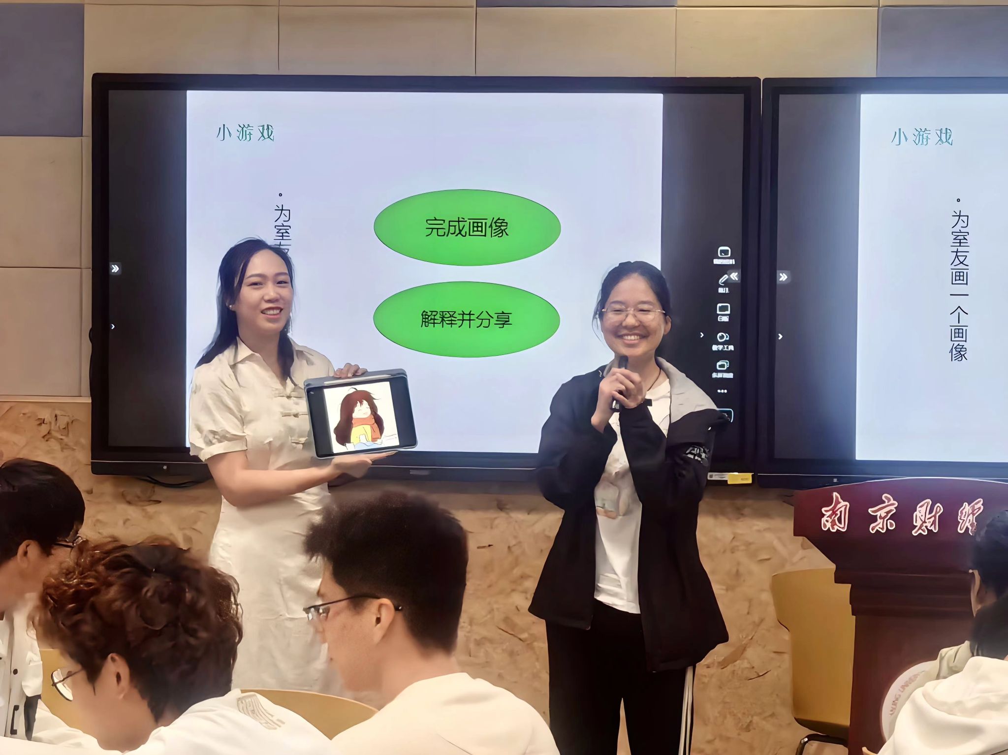 班会从一次小调查开始,围绕入学心情、生活环境等主题韩娅老师提出了一些小问题,让现场气氛一下子活跃了起来。韩老师随后呈现了一些大学新生常见的心理适应困扰,诸如学习动力不足、想念家人、不适应宿舍生活这样的问题在讲到时显然引发了很多同学的共鸣。除了提出问题,韩老师也希望同学们可以正视自己存在的这些问题。为了让同学们正确认识心理健康,韩老师介绍了心理健康的内涵与标志,并指出了一些调节方法。聚焦宿舍关系,韩老师还设计了一个舍友画像小游戏,以帮助同学们更好认识他人的同时认识自己,从而促进和谐寝室关系的建立。