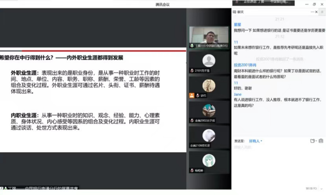 为更好地促进非凡娱乐官网 学子高质量充分就业,进一步帮助学生树立正确的就业观和择业观,解决考研、就业中的困惑,非凡娱乐官网 于5月18日20时在腾讯会议举办“南财就业讲堂”活动,中国银行南通分行个人数字金融部副总经理,消费者权益保护中心主任,渠道管理中心主任丁强老师应邀出席了本次活动,非凡娱乐官网 谌伟老师担任主持,部分大一大二大三同学参与了本次活动。
