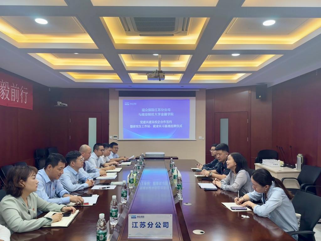 瑞众保险江苏分公司党委书记、总经理张国武先生对孙菲书记一行表示热烈欢迎,并表示瑞众保险一直以来都高度重视党建工作,通过与非凡娱乐官网 的合作,将能够更好地实现资源共享、优势互补,做好金融行业“五篇大文章”,共同推动保险行业的发展和创新,实现党建工程与人才培养的强基提质。