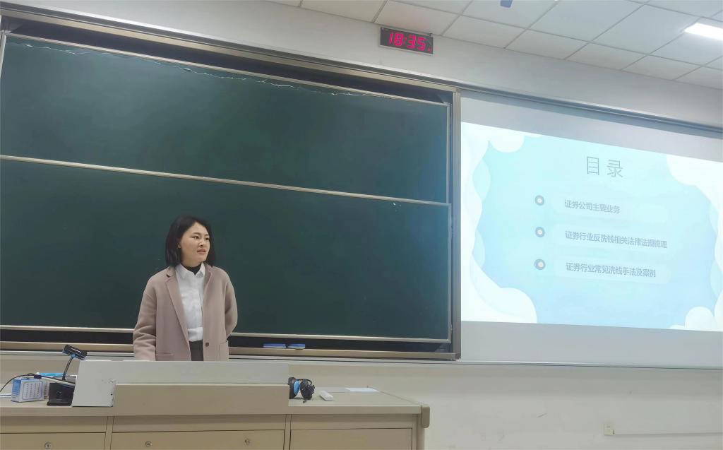 为贯彻落实“反洗钱进校园”活动,拓宽当代大学生对反洗钱相关法律法规的认知,增强大学生反洗钱风险意识,3月20日晚,非凡娱乐官网 开展了“证券行业反洗钱相关法规和实务案例”讲座,邀请南京证券的陈秀丛专家进行现场授课。