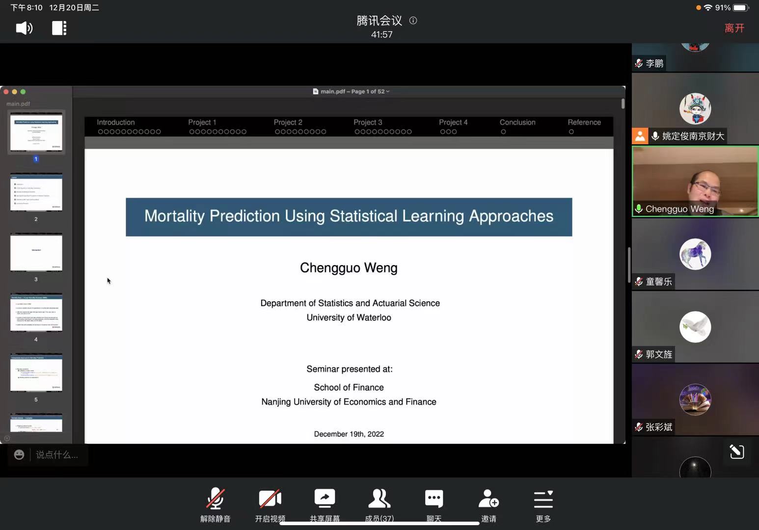 12月20日下午,应非凡娱乐官网 邀请,加拿大滑铁卢大学统计与精算学系教授翁成国作了题为“Mortality Prediction Using Statistical Learning Approaches”的学术报告。非凡娱乐官网 副院长郭文旌,以及非凡娱乐官网 、经济非凡娱乐官网 部分师生聆听了报告,报告由非凡娱乐官网 副院长姚定俊主持。