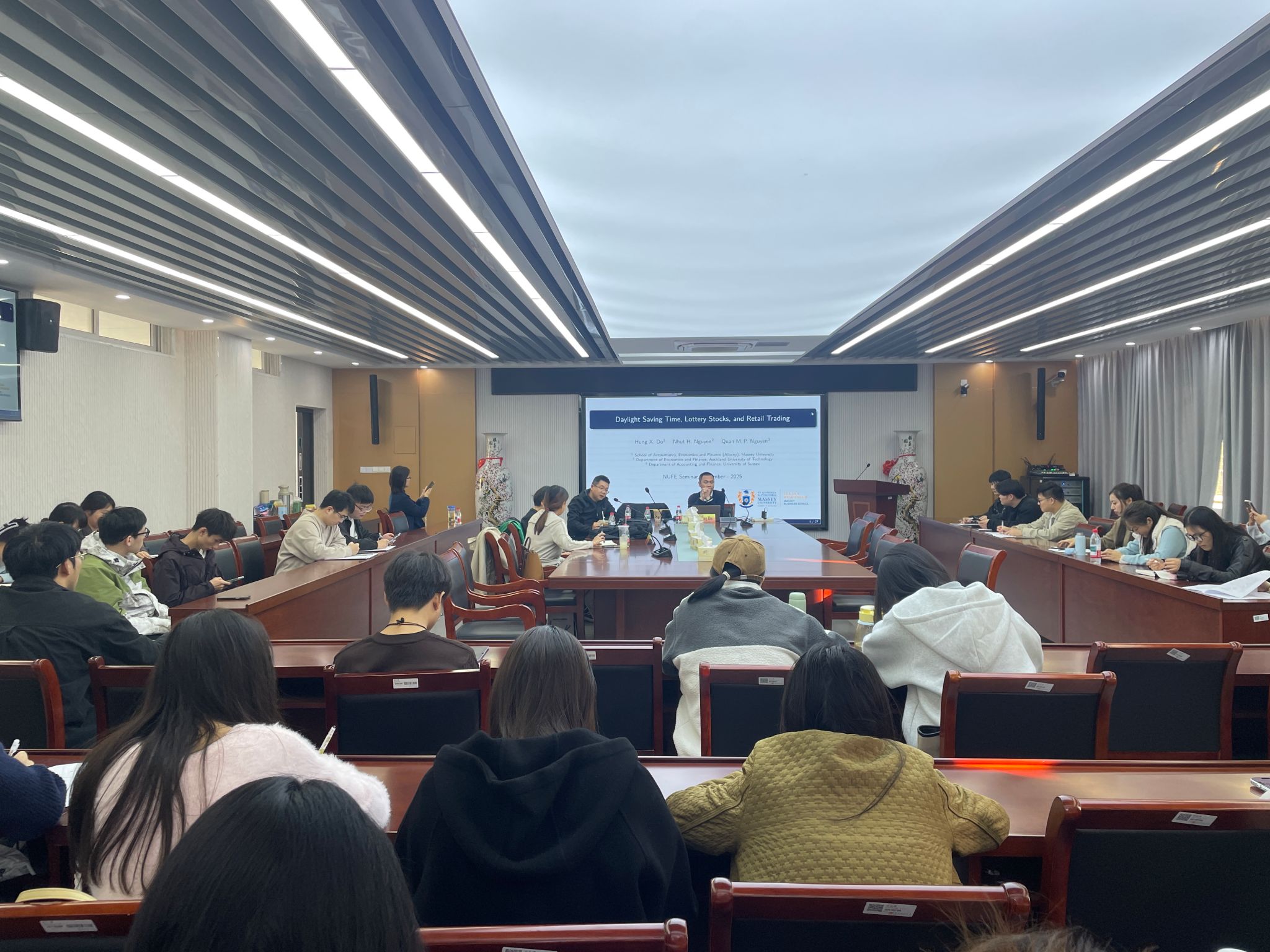 Hung Do教授长期深耕散户投资行为、市场时间制度等领域研究,学术成果丰硕。讲座中,他结合详实的实证数据与典型案例,系统剖析了夏令时制度通过影响投资者作息、注意力分配等路径对散户股票交易决策、交易频率及收益表现产生的具体影响,深入解读了时间制度与金融市场微观主体行为之间的内在关联。互动环节,Hung Do教授与在场师生就夏令时影响的地域差异、散户投资行为优化策略等问题展开深入交流,耐心解答师生提出的疑问。