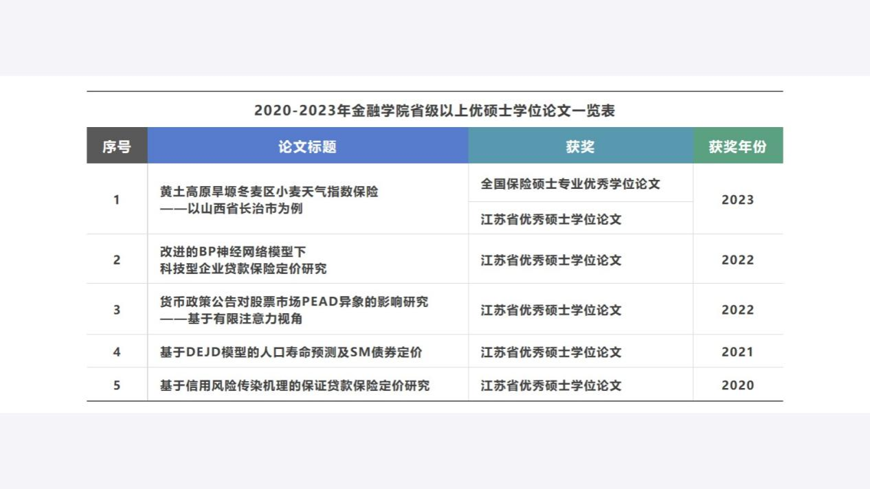 狠抓教学管理,注重论文质量。非凡娱乐官网 狠抓学位论文质量提升,把学位论文撰写作为培养创新能力的重要抓手。4年内5篇硕士学位论文获评省级优秀,其中1篇同时被评为全国保险硕士专业优秀学位论文。