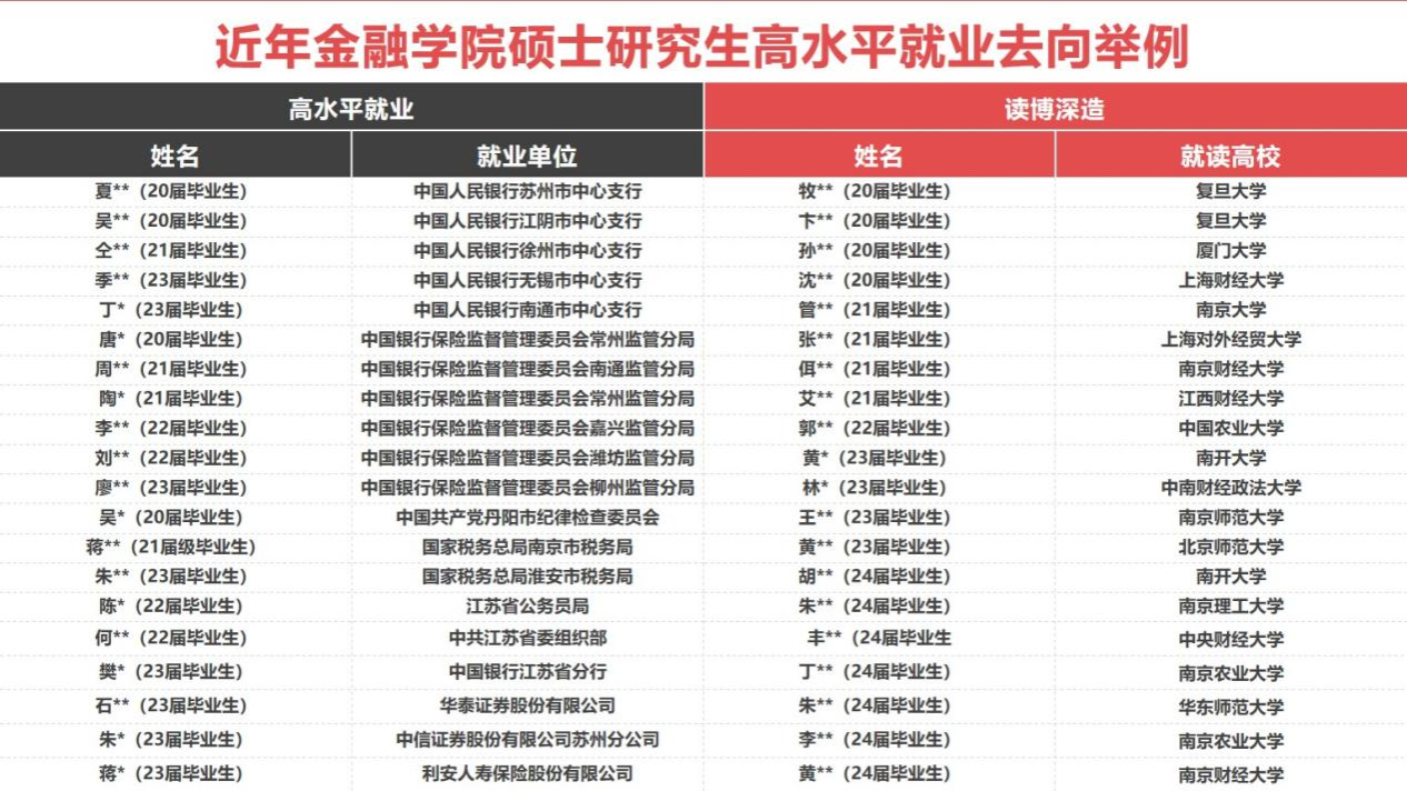 主要就业方向为各级人民银行以及与金融监管、财政、税务等相关的政府部门,各类商业银行、证券公司、保险公司、基金公司等金融机构工作,以及读博深造等。