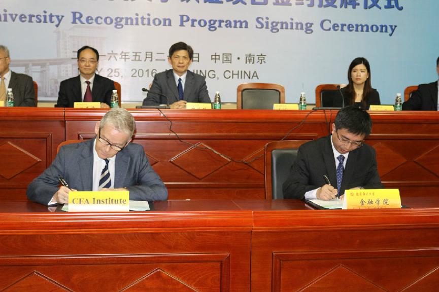 CFA 是“特许金融分析师”的简称,它是全球投资业里最为严格与高含金量的资格认证,由美国的 CFA 协会设立。 CFA持证人通常就职于各类银行、证券、基金、期货、保险等机构。由于两类人才的稀缺性,北京、上海、广州、深圳、南京等国内诸多城市均为他们制定了住房补助、人才津贴等优惠政策。。《金融时报》杂志于2006年将CFA专业资格比喻成投资专才的“黄金标准”。英国国家认证信息中心认为FRM认证相当于美英澳加等国的硕士学位水平。CFA证书为我国人力资源和社会保障部批准的国家职业资格证书。2016年3月底,南财大金融学本科及硕士专业同时顺利通过了美国CFA协会审核,成为江苏省首个CFA大学认证项目,也是迄今为止省内唯一同时获得金融学本科、硕士双认证的高校;2017年6月再次升级,首批加入 CFA 协会 University Affiliation Program(大学联盟)。