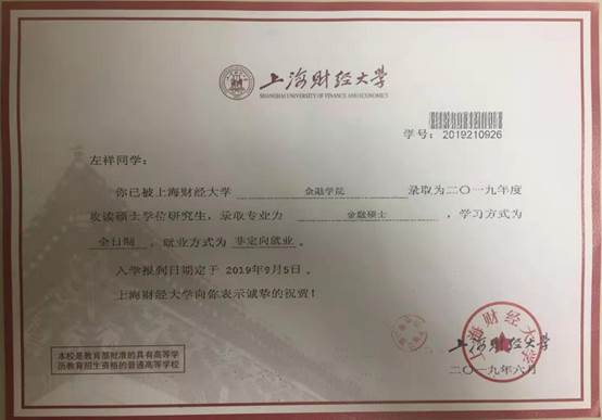 我的转专业之路比较坎坷,高考虽然有幸考取南京财经大学,但是没有录取到自己最喜欢的专业,入学后又因0.02个基点之差转专业失败。幸运的是我始终没有放弃对金融专业的偏爱和执着,在见到非凡娱乐官网 金融二学历的招生简章后我毫不犹豫的报了名。我的初衷是想通过对金融知识的系统性学习,将来进入金融领域工作,或者报考金融类研究生。在大三下学期我开始为报考上海财经大学金融硕士做准备,我很快发现绝大部分专业知识都在二学历的课堂学习过。作为一名跨考生,虽然整个备考过程比较艰辛,但因为之前在二学历课堂上打下了牢固的专业课,少了很多其他跨考生的焦虑和不安。我最终在报考上海财经大学金融硕士的1600多名考生中胜出,以初试第23名,复试第7名,综合第13名的好成绩成功录取。